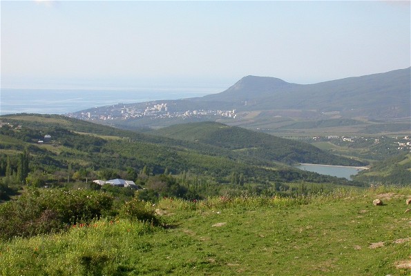 From the city’s central square, the Partisan Street leads WNW past some apartments, a hotel (N side) and Alushta Central Hospital (S side) followed by newer apartments on both sides and the main school south of the complex; beyond E 105 are the offices of the Crimean Nature Preserve with its Nature Museum and the dendrological park and zoo (N side). Vineyards flank Partisan Street on both sides as it becomes the Romanov Highway, aka highway P 34, as it leads to Izobylne where the Izobylne Water Reservoir was built (in 1979, at 70 meters, deepest of Crimean reservoirs, to supply Greater Alushta) on the Ulu-Uzen River. From Izobylne, highway P 34 passes the village of Rozovyi and the Kosmo-Diaman Monastery over the mountains to Yalta.