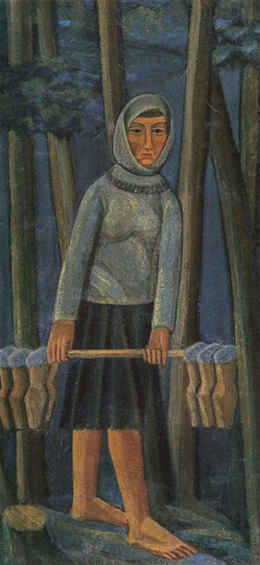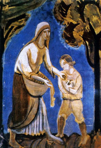 While in Paris at the end of the 1910s, Boichuk witnessed the birth of modern art and attempted to blend it with aspects of the Ukrainian tradition, developing a style of simplified monumental forms. In his compositions, surfaces are rhythmically integrated with lines. This style became known as Boichukism. (Some art scholars also consider Boichuk to be the founder of the style of Neo-Byzantinism.) Its followers made up a dominant part of the membership of ARMU, which was often attacked by official critics for ‘formalism,’ ‘bourgeois nationalism,’ and focusing on the countryside. After ARMU was disbanded and Boichuk was executed, most of his frescoes and paintings were destroyed, including those found in Lviv museums after the Second World War. Since then, however, a number of Boichuk’s works have reappeared. The principles of Boichukism were followed by a large number of admirers, who sometimes (eg, Nalepinska and Padalka) went on to create their own schools.