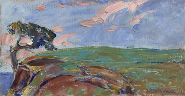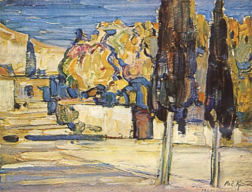 As a painter Krychevsky was deeply influenced by French impressionism. The pure and harmonious colors of his south-Ukrainian landscapes (such as A Crimean Landscape [1921], A Tatar House in Alushta [1923], and Alushta [1923]) or Kyiv cityscapes (such as View of Kyiv from the Holosiv District [1928], Podil [1934], and The Irynynska Street in Kyiv [1942]) (done in oils and watercolors) convey a lyrical atmosphere. His paintings were first exhibited in Kharkiv in 1897. He participated in the annual exhibitions of the Society of Russian Watercolorists in Saint Petersburg (1899–1902) and, later, in the exhibitions of the Kyiv painters (1910–13). Altogether he did about 300 paintings. Krychevsky is one of the main founders of modern Ukrainian book design. In his work he used traditional folk ornamentation and motifs in old Ukrainian books, and revived the old techniques of wood engraving, etching, and lithography. He designed over 80 bookcovers, some bookplates, and a number of entire books, including the deluxe edition of Ukraïns’ka pisnia (Ukrainian Song, 1935). At Mykhailo Hrushevsky's request he designed the state emblems and seals of the Ukrainian National Republic and a number of bank notes. From 1907 through to 1910, Krychevsky designed sets and costumes for some 15 plays and operas produced by the Sadovsky’s Theater in Kyiv, including Mykhailo Starytsky's Bohdan Khmel’nyts’kyi, Ivan Karpenko-Kary's Sava Chalyi, B. Smetana's The Bartered Bride, and S. Moniuszko's Halka. Then in 1917–18 he worked with the Ukrainian National Theater. Noted for their realism and attention to detail, his sets occasionally assumed an abstract or grotesque character to match the atmosphere of the drama. In the Soviet period he served as a consultant or artistic director for 12 films shot in Ukraine, including Taras Shevchenko (1926), Taras Triasylo (1927), Zvenyhora (1928), and Sorochyns’kyi iarmarok (The Sorochyntsi Fair, 1939), the first Ukrainian color film.