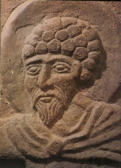 Only a few sculptures from the period of Kyivan Rus’ (10th–12th centuries) have been preserved. Two reliefs from Saint Michael's Golden-Domed Monastery in Kyiv show Saints Nestor and Demetrius and Saint George and Saint Theodosius of the Caves (11th century). The stylized, detailed hair and armor of Nestor and Demetrius suggest Eastern prototypes; the hair and armor of George and Theodosius show a greater simplification of planes, as in Greek models. Two panel reliefs found in the catacombs of the Kyivan Cave Monastery are thought to represent Hercules fighting a lion and Cybele on a chariot, themes from classical antiquity that have antecedents in sculptural reliefs found at the sites of Hellenic colonies on the northern Black Sea coast (see Ancient states on the northern Black Sea coast). A sarcophagus with relief carvings from the Church of the Tithes in Kyiv is thought to be that of Princess Olha, and the sarcophagus from the Saint Sophia Cathedral in Kyiv is considered to be that of Grand Prince Yaroslav the Wise, the founder of the shrine. The latter has relief carvings of crosses intertwined with plant motifs and depictions of fish and birds. The 16 stone panels in the Saint Sophia Cathedral (11 of which are in the choir section) are carved with geometric patterns interspersed with foliage, fish, birds, and crosses. The panel above the fresco (see Fresco painting) of Prince Yaroslav's family contains an eagle, an ancient symbol of Jupiter and the Roman emperors. The capitals of Saints Borys and Hlib Cathedral in Chernihiv (late 12th century) contain carvings of exotic part-dog, part-bird, and part-dragon animals similar to the likeness of the pagan god Simarhlo. These have antecedents in Romanesque sculpture, as do the carvings found in the main portals of Saint Panteleimon's Church in Halych.
