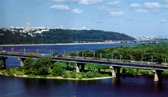 From Kyiv to the city of Dnipro the Dnipro flows along the boundary between the Dnipro Upland and the Dnipro Lowland. The river valley is asymmetrical here: the right bank rises to 100–150 m above the river, is deeply dissected by valleys and gullies, and is covered with forest. It forms a picturesque mountain landscape. Kyiv lies in these ‘Dnipro Mountains.’ Below Kyiv, in the Kaniv Hills, is located the grave of Taras Shevchenko. The left bank of the river is low, sandy, and often covered by pine forest. It rises towards the east in broad terraces. The river valley is wide—6–10 km, and at Pereiaslav and Cherkasy, 15–18 km—while the river is 200–1,200 m wide. Below Cherkasy the Dnipro splits into sidestreams and creates islands. Its depth varies frequently, from 1.5 to 12 m. The tributaries that empty into the middle Dnipro are smaller than those in the upper Dnipro and carry much less water. The tributaries on the right side—the Stuhna River (68 km), the Ros River (346 km), and the Tiasmyn River (194 km)—flow in short, narrow beds carved in granite. The tributaries on the left originate usually in the Central Upland and cross the whole Dnipro Lowland. They are longer and wider, with low banks and terraces. The rivers are the Trubizh River (113 km), the Supii River (130 km), the Sula River (310 km), the Psol River (692 km), the Vorskla River (425 km), and the Samara River (311 km). They do not greatly increase the water volume of the Dnipro.