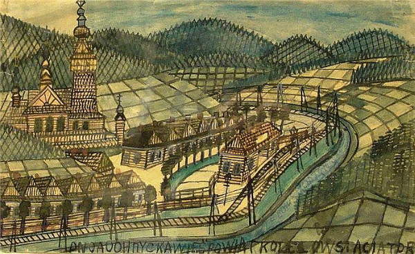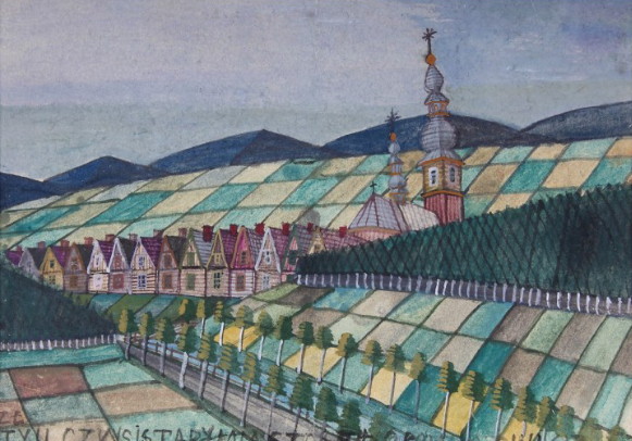 Nykyfor [Никифор; real name: Дровняк, Епіфаній; Drovniak, Epifanii; Polish: Nikifor Krynicki], b 21 May 1895 in Krynytsia (Krynica), Nowy Sącz county, Galicia, d 10 October 1968 in Krynytsia (Krynica). Lemko naive painter. A deaf son of a beggar woman, he supported himself from his teens by begging for food or a few coins in exchange for his small drawings and watercolors. He was discovered by Ukrainian and Polish artistic circles in the 1930s. With the help of Roman Turyn, one of his earliest discoverers, his works were exhibited in Paris in 1932. Over 100 of his works were included in an exhibition of self-taught artists held by the Association of Independent Ukrainian Artists in Lviv in 1938. Like other Lemkos, he was deported to northern Poland by the Polish authorities during Operation Wisła after the Second World War. He returned illegally twice to Krynytsia before he was allowed to stay. In the 1950s and 1960s his works were exhibited in London, Rome, Belgrade, Amsterdam, Paris, Brussels, Florence, Liège, Haifa, Vienna, Frankfurt am Main, Chicago, Basel, Rotterdam, Lviv, Kyiv, and New York. In his lifetime Nykyfor produced over 30,000 small color drawings or watercolors depicting existing and imaginary Lemko buildings, churches, landscapes, saints, and individuals (often himself). In style some of his works belong to the Lemko tradition of folk icon painting on glass; others are typical of naive art in general.