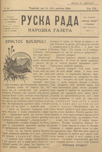 Ruska Rada society [Руська рада]. A Bukovynian political organization founded in Chernivtsi in 1870 by members of the Ruska Besida in Bukovyna society. Its first president was Rev Vasyl Prodan. The society’s members informed the Ukrainian public about political matters and organized election campaigns. Until 1885 the society was dominated by Russophiles and thereafter by populists (led by Ivan Tyminsky, Yerotei Pihuliak, Omelian Popovych, and I. Okunevsky), who published the organs Ruska rada (1898–1908) and Narodnyi holos (1909–11). From 1904 to 1914 the president was Stepan Smal-Stotsky. After the creation of Ukrainian parties in Bukovyna in 1906, the society’s political role was diminished. In 1913 it had 842 members. The society was banned by the Romanian regime in 1923.