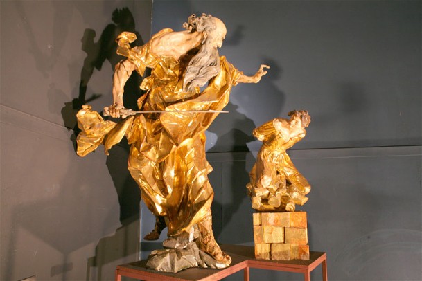 These achievements resulted from efforts by talented local sculptors and imported ones, such as Jan Pfister and Johann Georg Pinzel. In Pinzel's carved Crucifixion with Mary and Saint John (1750s) in Saint Martin's Church in Lviv, the polychromatic wooden figures are unequaled in the clarity of their contrasting planes and their dramatic juxtaposing of drapery folds. In contrast the polychromatic figure of Saint Michael the Archangel, the patron saint of Kyiv, from the tower of the town hall in Kyiv lacks sophistication. It was executed from two sheets of copper fitted over a silhouette.