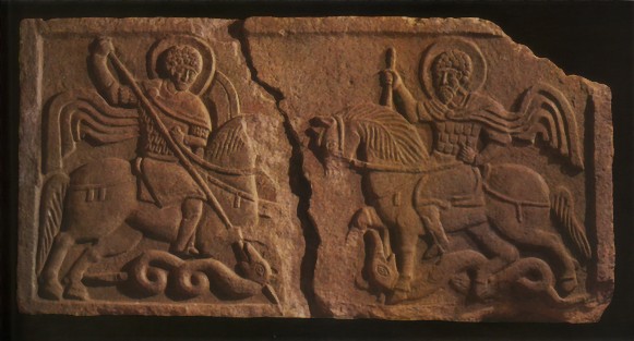 Only a few sculptures from the period of Kyivan Rus’ (10th–12th centuries) have been preserved. Two reliefs from Saint Michael's Golden-Domed Monastery in Kyiv show Saints Nestor and Demetrius and Saint George and Saint Theodosius of the Caves (11th century). The stylized, detailed hair and armor of Nestor and Demetrius suggest Eastern prototypes; the hair and armor of George and Theodosius show a greater simplification of planes, as in Greek models. Two panel reliefs found in the catacombs of the Kyivan Cave Monastery are thought to represent Hercules fighting a lion and Cybele on a chariot, themes from classical antiquity that have antecedents in sculptural reliefs found at the sites of Hellenic colonies on the northern Black Sea coast (see Ancient states on the northern Black Sea coast). A sarcophagus with relief carvings from the Church of the Tithes in Kyiv is thought to be that of Princess Olha, and the sarcophagus from the Saint Sophia Cathedral in Kyiv is considered to be that of Grand Prince Yaroslav the Wise, the founder of the shrine. The latter has relief carvings of crosses intertwined with plant motifs and depictions of fish and birds. The 16 stone panels in the Saint Sophia Cathedral (11 of which are in the choir section) are carved with geometric patterns interspersed with foliage, fish, birds, and crosses. The panel above the fresco (see Fresco painting) of Prince Yaroslav's family contains an eagle, an ancient symbol of Jupiter and the Roman emperors. The capitals of Saints Borys and Hlib Cathedral in Chernihiv (late 12th century) contain carvings of exotic part-dog, part-bird, and part-dragon animals similar to the likeness of the pagan god Simarhlo. These have antecedents in Romanesque sculpture, as do the carvings found in the main portals of Saint Panteleimon's Church in Halych.