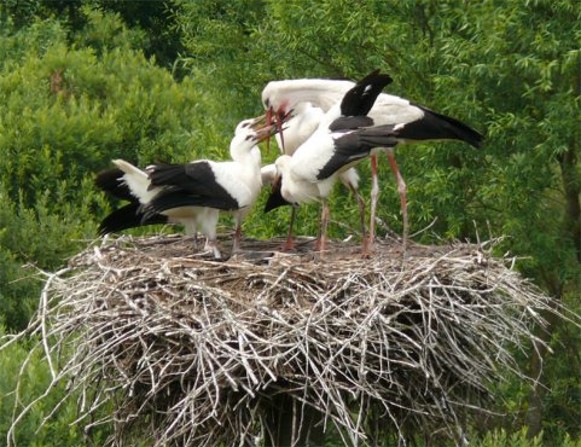 Stork (Ciconia; Ukrainian: лелка, бузько, чорногуз; leleka, buzko, chornohuz). Large birds with long necks and legs of the family Ciconiidae (order Ciconiiformes). Storks range from about 60 cm to over 150 cm in height and weigh up to 4.5 kg. They are migratory birds that breed in Europe and winter in southern Africa. While breeding they nest on trees or, as in Ukraine, on buildings where a wagon wheel has been set up to serve as the base of the nest. Two species predominate in Ukraine: Ciconia nigra or black stork (black with a white spot on the belly and red legs and bill) in the Carpathian Mountains and in Polisia, and Ciconia ciconia or white stork (white with black wing feathers, a dark red bill, and reddish legs), found over the whole of Ukraine. Storks have become an endangered species and are now protected by law.